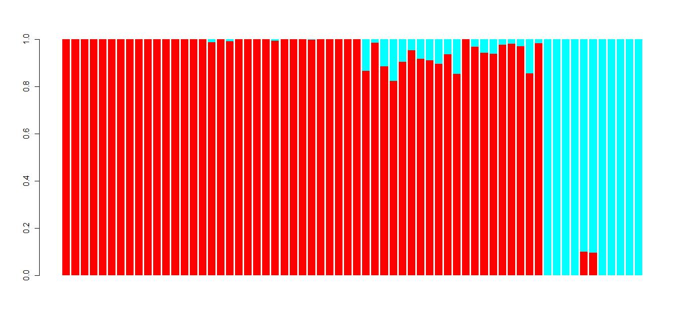 Note also, that this is all done automatically: no one told ADMIXTURE to identify these two poles: it was the presence of unlabeled individuals from different ends of the spectrum that influenced the admixture estimates for the rest.