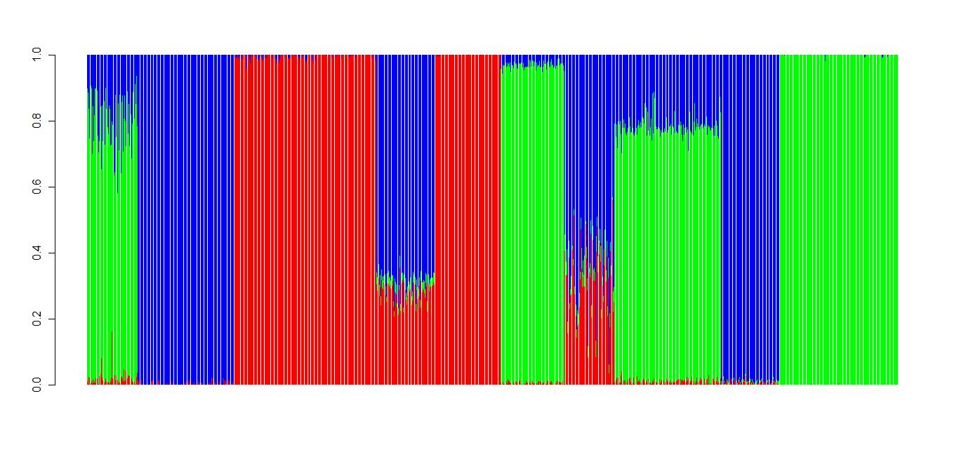 K=3: Notice: Asian red+Caucasoid blue on Gujarati Indians and Mexicans. At this level of resolution, these two populations look similar. Notice presence of blue in East Africans but not Yorubans (green at the end).