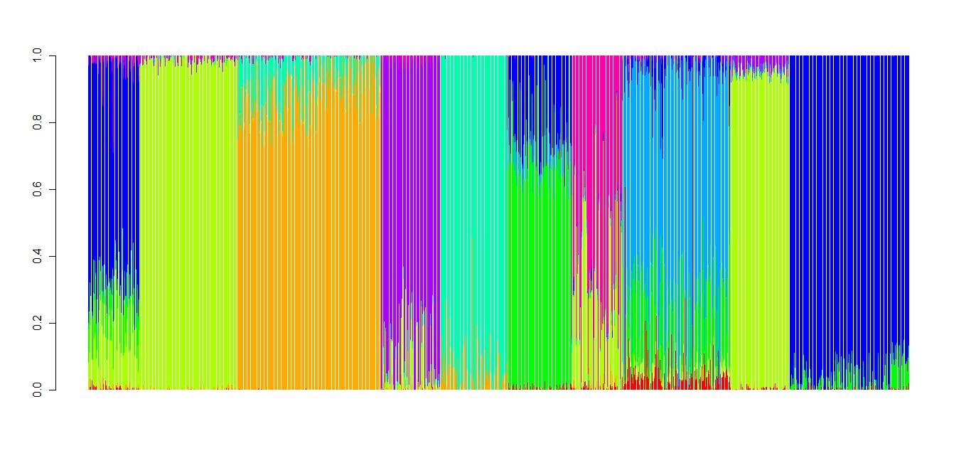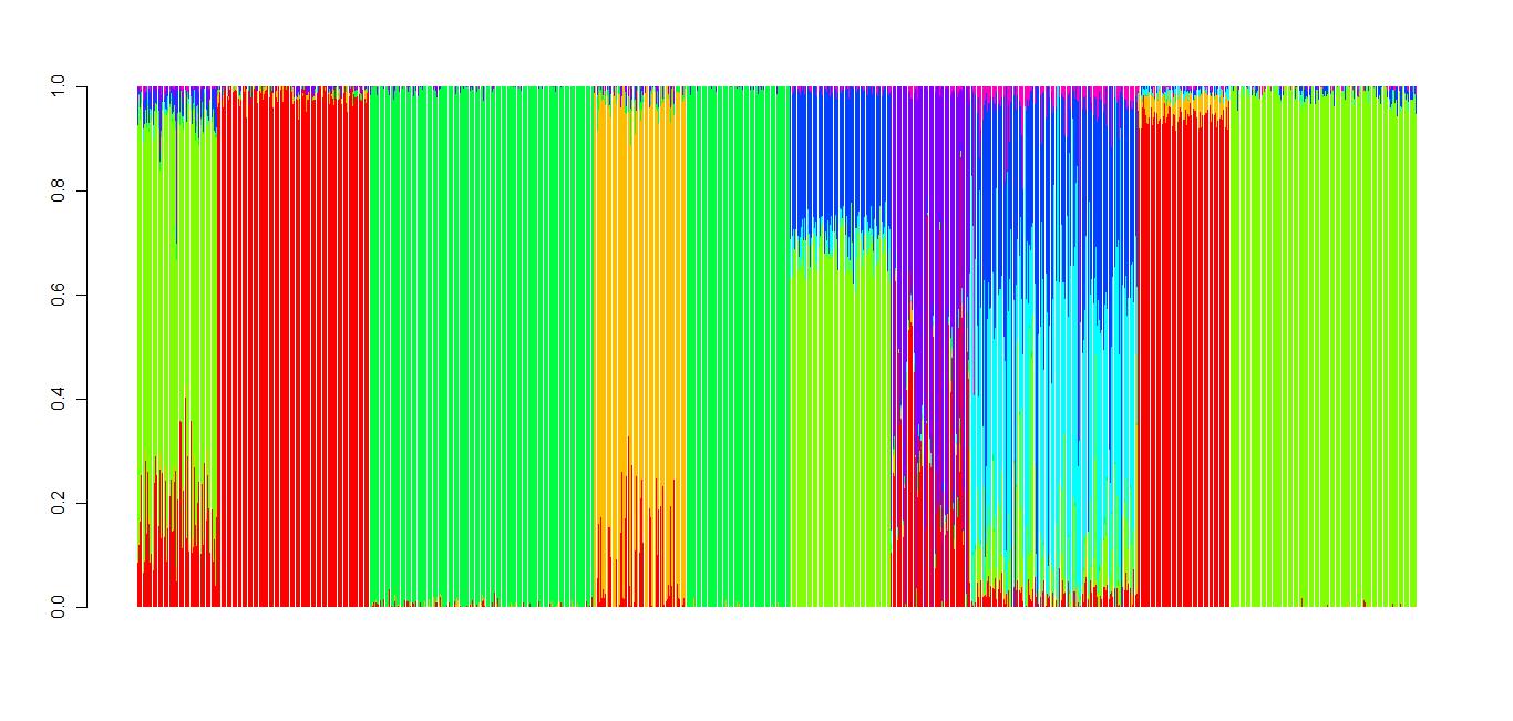 Something else that you can pick up from these plots is the degree to which admixture has distributed itself throughout a population. For instance, at K=8, the Lubya dark blue/green admixture is evenly distributed across the population. Not so for Mexican and Maasai admixture. There's quit a lot of "chatter" in those distributions.