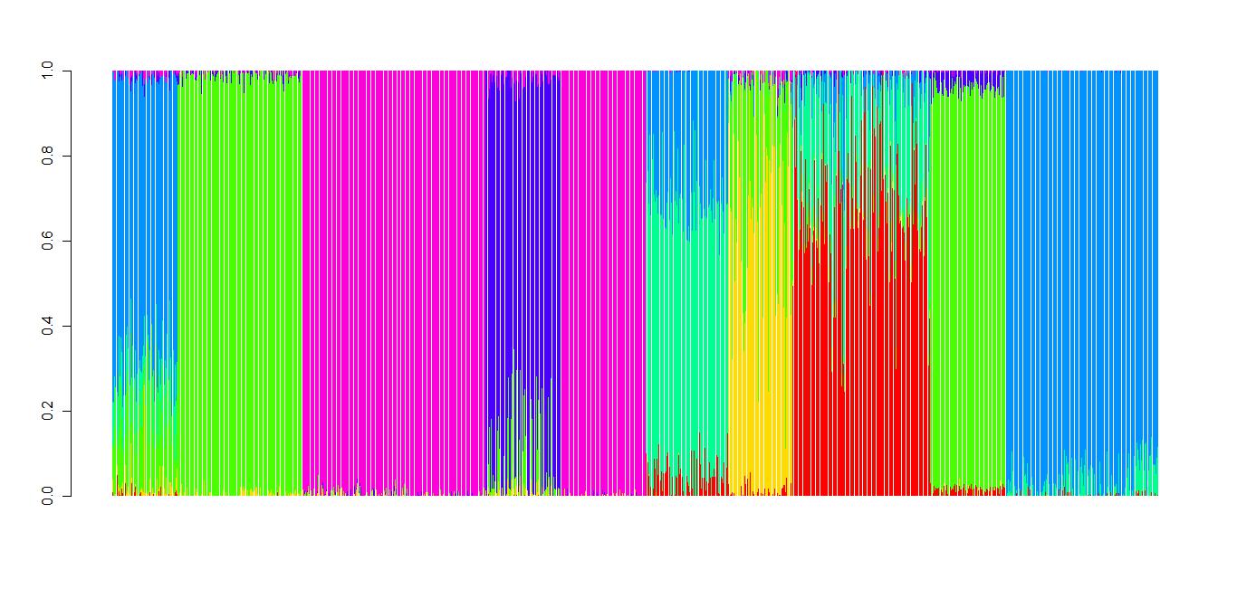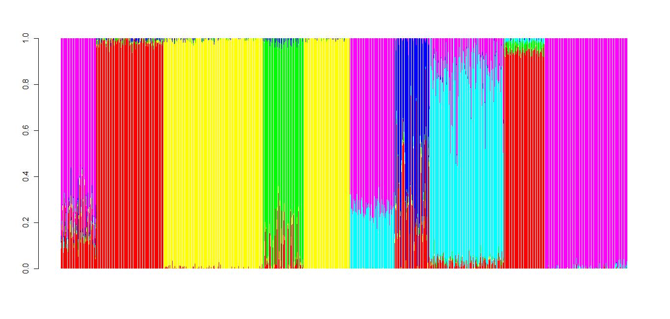 K=5: Gujarati Indians now get their own (purple) cluster. Here the difference between Luhya (mostly Sub-Saharan blue + East African yellow) and Maasai (the reverse) is quite striking. The former are Bantu speakers and thus not indigenous to east Africa.