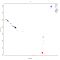 Naturally, we want to be able to assess how good a particular classification is. Fortunately, this is easy to do with mclust and its uncertainty feature. Looking at my 692-individual dataset, 687 have a less than 5% uncertainty level, and 682 have less than 1%. I did not inspect these fully, but some of them are "borderline" individuals who might belong on several components, e.g., a Frenchman who could either go to the CEU-French cluster #1 (36% probability) or the North/Central Italian-Spanish cluster #3 (64% probability).