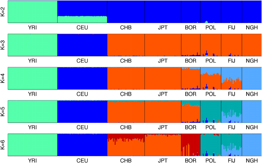 frappe analysis on the left: New Guinea Highlanders split at K=4 (light blue), with Polynesian-Fijians remaining aligned with East Asians; at K=5 the specificity of the East Eurasian component in Polynesians-Fijians (teal) is revealed; at K=5 the specificity of Borneo is apparent (red), but there are individuals of clearer East Asian ancestry remaining.