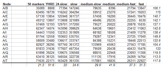 Below is Tim's table of age estimates in years. I have added an extra row and extra column: this contains the standard deviation of each column/row divided by the average (in %), and is useful to quantify how varied the age estimates are across different BT haplogroups and across different marker sets.