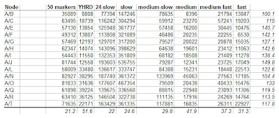 Tim went a step further, and he did his comparisons on different sets of markers: slow-evolving ones to fast-evolving ones. Again, age estimates with fast vs. slow-evolving markers should give similar age estimates. If they do not, then this means that an age estimate is a product not only of the true age of a lineage, but also of the particular mix of fast- and slow-evolving markers that one uses.