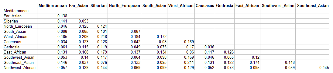 For example, in my recent K12a admixture experiment, the six components. I named Mediterranean, North_European, Caucasus, Gedrosia, Southwest_Asian, and Northwest_African have a maximum Fst between any two of them of 0.073 (between Gedrosia and Northwest_African), and a mimimum Fst between any of them and any of the others of 0.075 (between Gedrosia and South_Asian). Henceforth, I will call these six components simply "the Six."