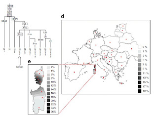 We addressed this issue here by analysing the G2a4-defining L91 SNP in 7,797 chromosomes from 30 regions across Europe. Fig. 3d shows the spatial frequency distribution of G2a4 throughout Europe. The highest frequencies (25 and 9%) occur in southern Corsica and northern Sardinia, respectively, (Fig. 3e) while in mainland Europe the frequencies do not reach 1%.UPDATE II (Autosomal DNA):