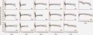The Turks are weird. They have the largest effective population back to the paleolithic. The population actually takes a hit exactly at the start of the neolithic!! Did it arrive from elsewhere causing disruption or was innovation stimulated by a catastrophe? The Turks are the only folk who seem to have a rise in effective population as the neolithic gets underway (around 11kya). Nothing similar is seen in Europe 5-7kya as the neolithic arrives there. There is also a paleolithic population surge around 35kya. Is this hump an Aurignacian "civilization" in Anatolia that predated the Greeks? There is a kind of poetry in the imagining of slow walk of evolving cultures from the East to the West.