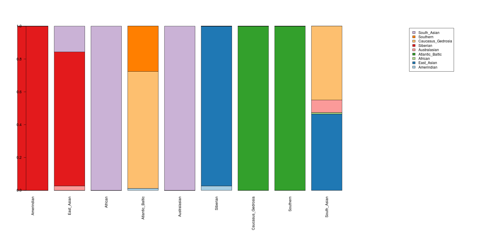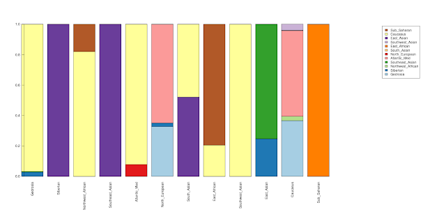 K7b and K12b, and carried out a K=3 ADMIXTURE analysis, which resulted in 3 components centered on West Eurasia, Asia, and Africa. I chose not to use an African component from higher-K (e.g. the K7b calculator), because it is conceivable that African ancestry might be lurking in southern Caucasoid components inferred with these tools (e.g., the "Southern" component of K7b or the "Southwest Asian" one of K12b). The