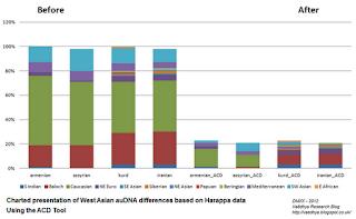 Vaêdhya has created a new ACD tool that allows one to visualize differences between sets of populations in terms of admixture components. He also posts two examples of the application of his tool on data generated by myself in the Dodecad Project, as well as by the Harappa Project.